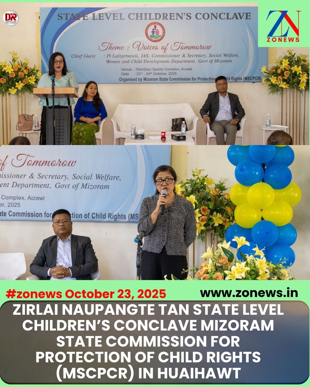 #ZONEWS Aizawl October 23, 2025: Vawiin khan ni-2 awh tur State Level Children’s Conclave, Ramhlun Sports Complex-a huaihawt chu khuallian, Pi Lalzarmawii, IAS, Commissioner & Secretary, Social Welfare & Women and Child Development Department chuan Wrestling Hall, Ramhlun Sports Complex-ah khuhhawnna a nei. He Children’s Conclave hi Mizoram State Commission for Protection of Child Rights (MSCPCR) ina a huaihawt a ni a, a vawi 1-na a ni.