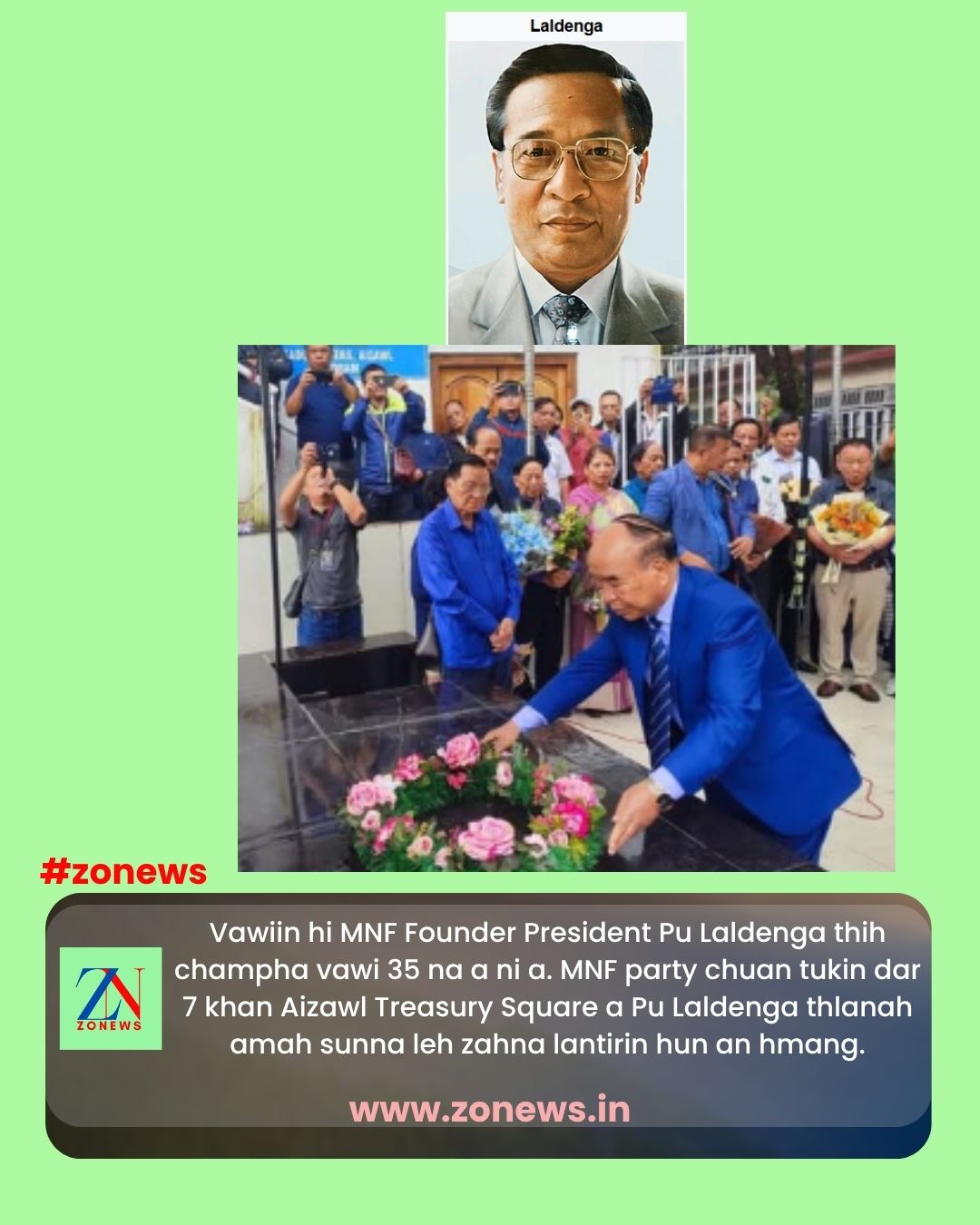 #ZONEWS July 7, 2025: Vawiin hi MNF Founder President Pu Laldenga thih champha vawi 35 na a ni a. MNF party chuan tukin dar 7 khan Aizawl Treasury Square a Pu Laldenga thlanah amah sunna leh zahna lantirin hun an hmang.